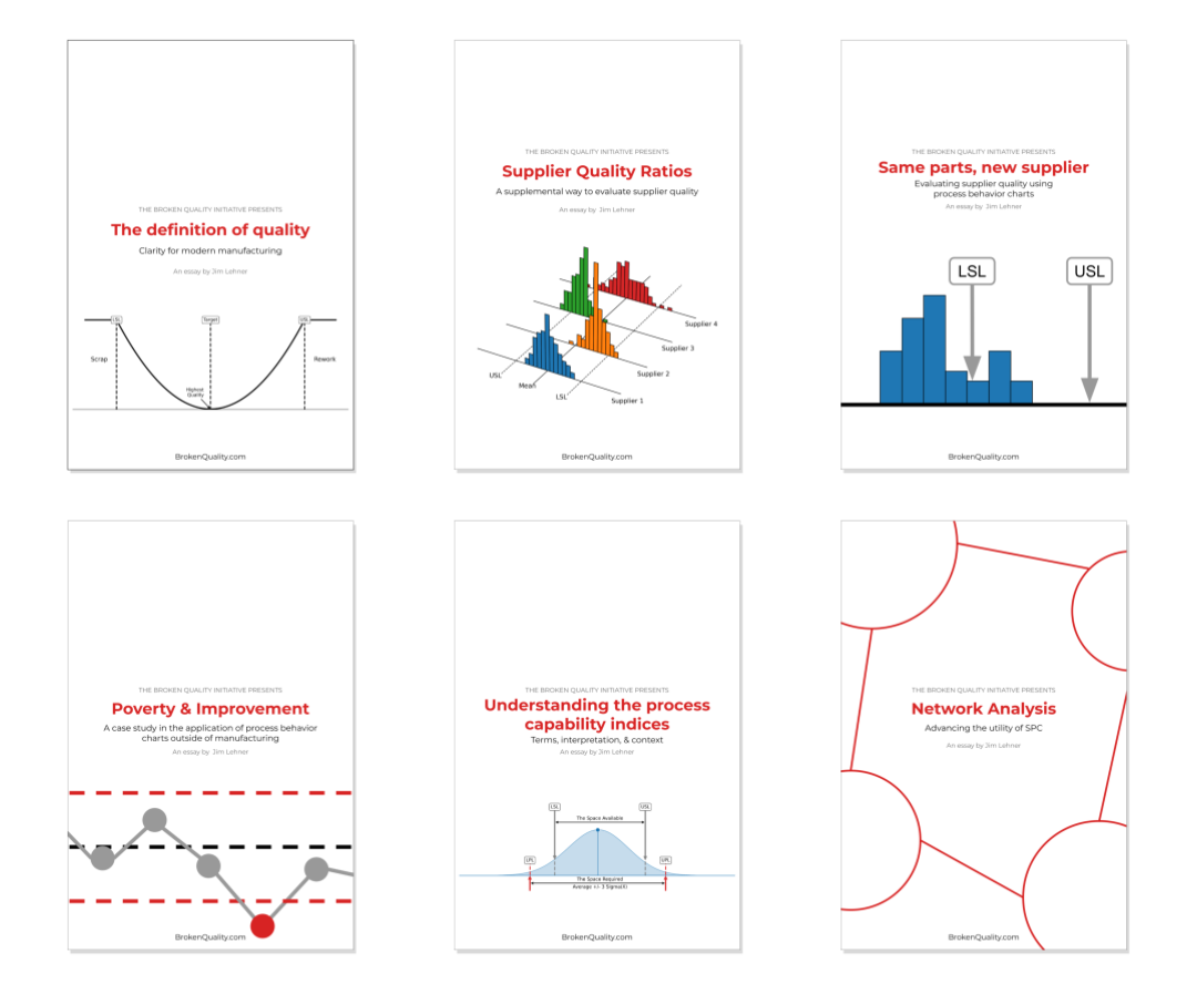 The Broken Quality Bookshelf is a repository of essays that explore theoretical and practical applications of process behavior charts. Some of the essays include: