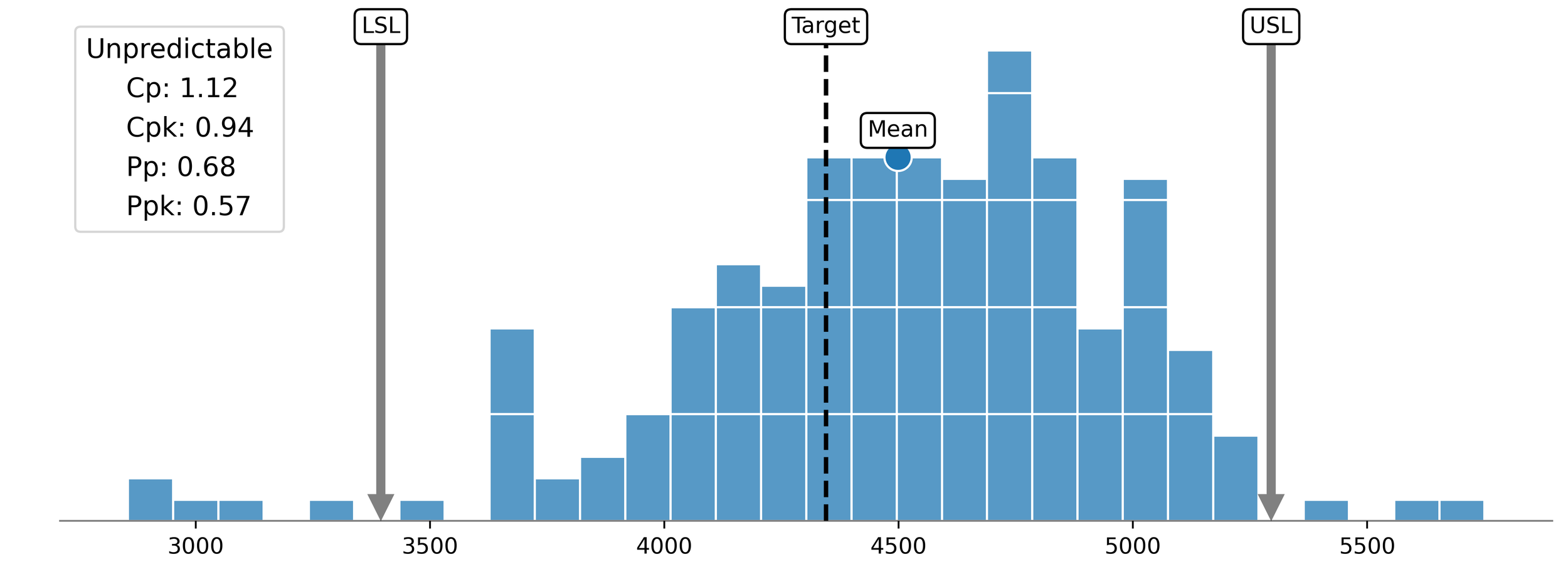 While process behavior charts reveal the types of variation that influence process behavior, they do not reveal how the process is operating with regard to specifications. Thus, in addition to a process behavior chart, process capability indices should also be presented with a capability histogram like the one shown in Figure 3. Capability histograms reveal the shape, center, and spread of process data in the context of the Upper Specification Limit (USL), the Lower Specification Limit (LSL), the target and the mean of the distribution. The specification limits define the voice of the customer. They define what a customer is willing to pay for and what they will accept.