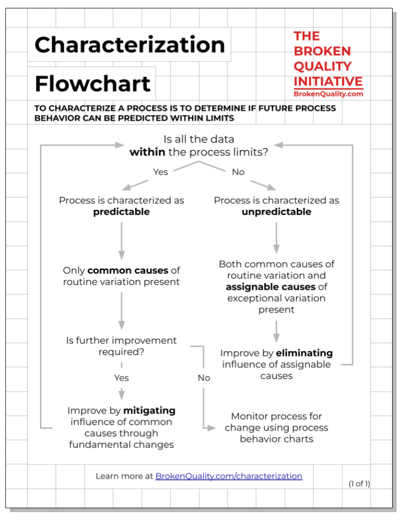 The implicit knowledge conveyed to an audience through the labels of predictable and unpredictable forms the backbone of characterization. Process characterization imbues meaning that is both overt and implied. This puts data in a context that, even without viewing a process behavior chart, enables an audience to understand process behavior. It conveys implicit knowledge about the types of variation that are at work and the corresponding actions that must be taken.