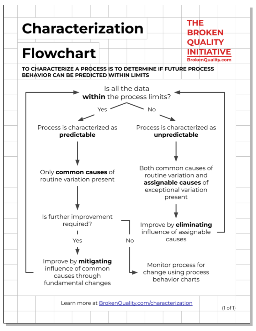 To characterize a process is to determine if future process behavior can be predicted within limits. The characterization flowchart outlines the logic of characterization and the actions that follow based on the question: Is all the data within the process limits?