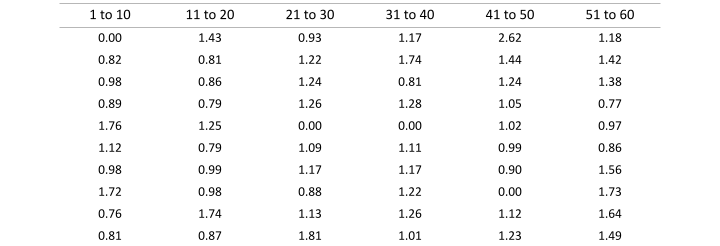 The sum of the moving ranges in Table 2 is 26.62. The number of moving ranges in Table 2 is 59, one less than the number of values in the original dataset. The resulting average moving range is 0.44.