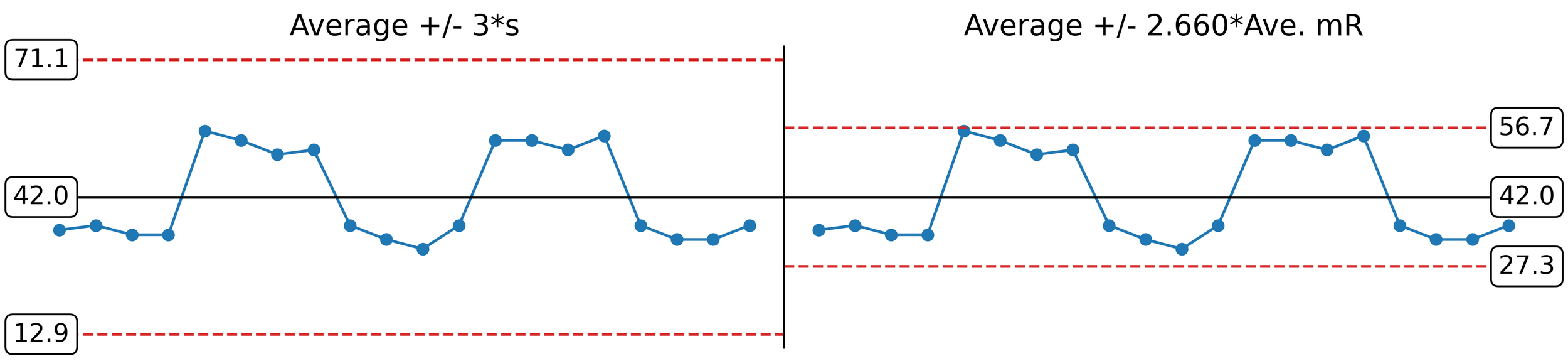 In Figure 2 the data is composed of logically comparable individual values all from the same underlying causal system. We built an XmR chart for this data in the previous section (Revisit this section by clicking here). In Figure 2, the chart on the left shows limits that are calculated using the formula Average +/- 3 Sigma, while the limits for the chart on the right are calculated using the formula Average +/- 2.660*mR-bar. The wider limits that result from adding and subtracting three times the standard deviation to the mean yield a chart that is less sensitive than its counterpart.
