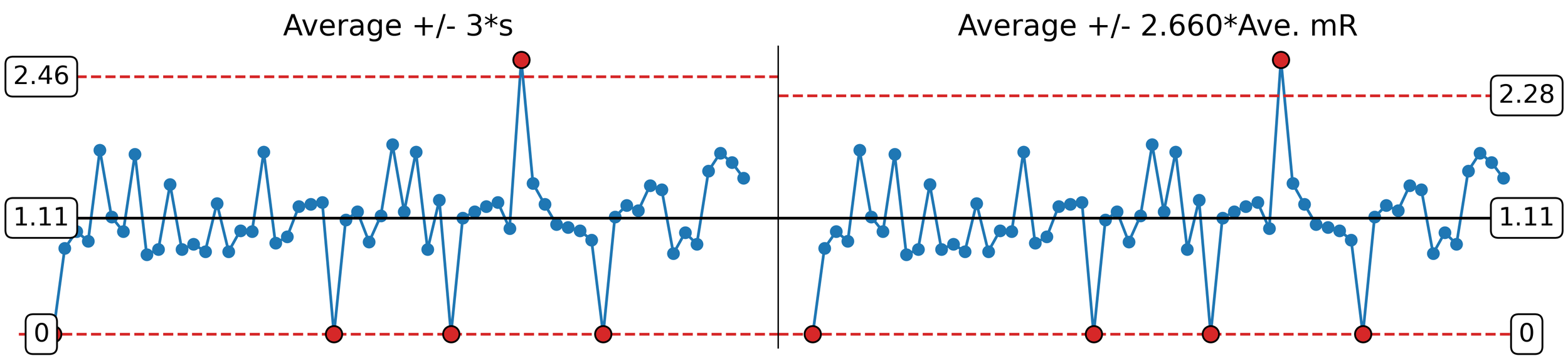 While the Lower Process Limit (LPL) for both charts in Figure 2 is zero, the Upper Process Limit (UPL) for the chart using the global standard deviation is 0.18 units greater than the chart that uses the scaling factor and average moving range. While in this particular case, the inflated value of the Upper Process Limit (UPL) does not change the characterization of the underlying causal system (Learn more about characterization here), in instances where values hover near the process limits this discrepancy can be the difference between detecting an assignable cause of exceptional variation and missing it.