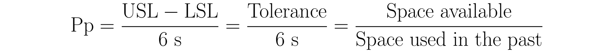The Performance Ratio, Pp, compares the space available to a process that is allotted by the tolerance, with the space used in the past by the process, as defined by 6 s. The formula for the Performance Ratio is: