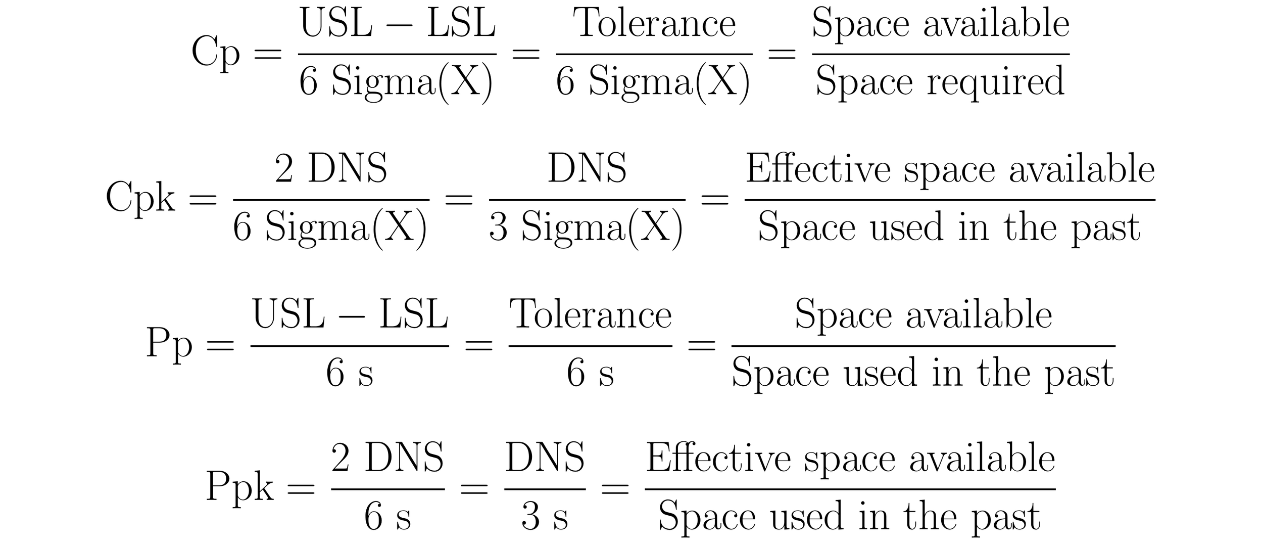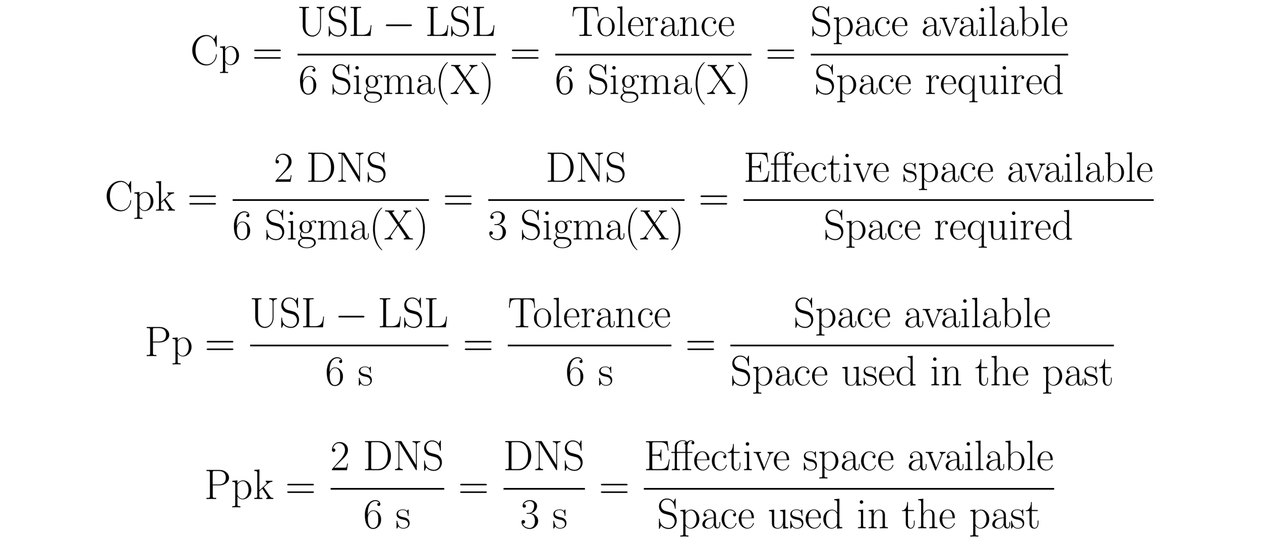 The process capability indices, as they are widely used by industry today, are the capability ratio, Cp, the centered capability ratio, Cpk, the performance ratio, Pp, and the centered performance ratio, Ppk. Collectively, the indices contain “all of the information regarding the relationship between the process and the specifications that can be incorporated into numerical summaries” (Wheeler, More Capability Confusion, 3). The formulas for the process capability indices, as defined by the statistician and quality control expert Donald J. Wheeler, are: