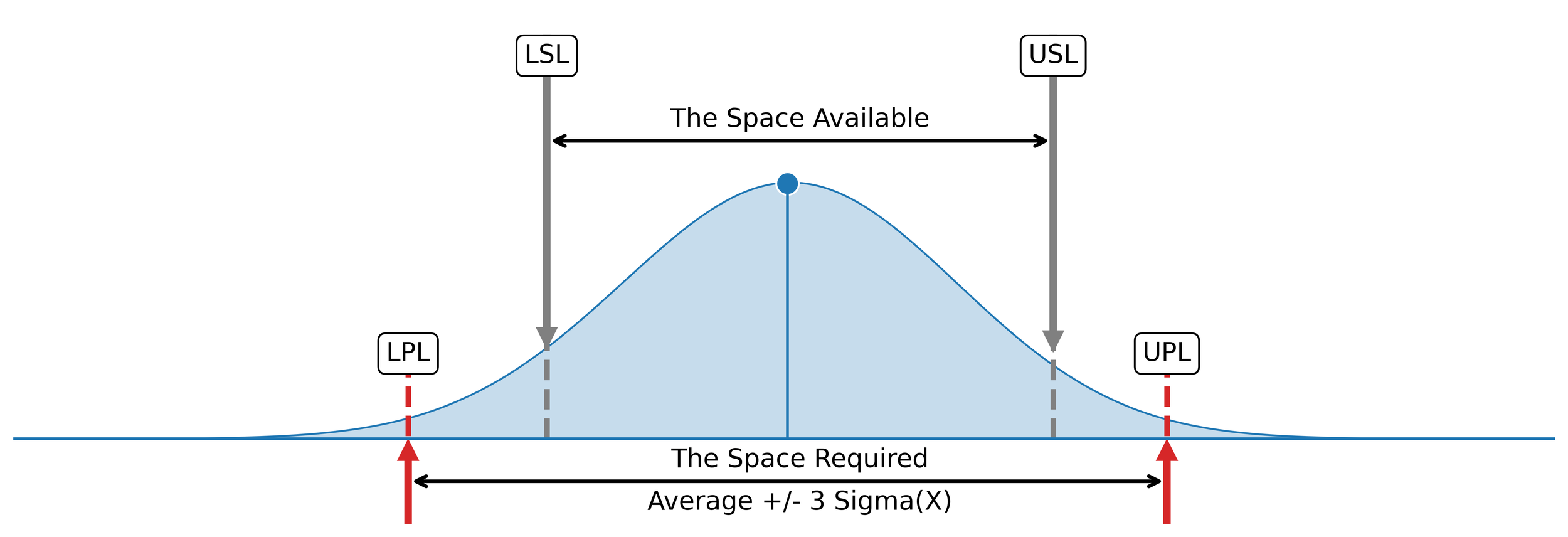 To understand the process capability indices an understanding of their requisite parts is required. The Tolerance defines the acceptable range within which performance or quality characteristics may vary, thereby defining the total space available for the process. To calculate the tolerance, subtract the Lower Specification Limit (LSL) from the Upper Specification Limit (USL).: