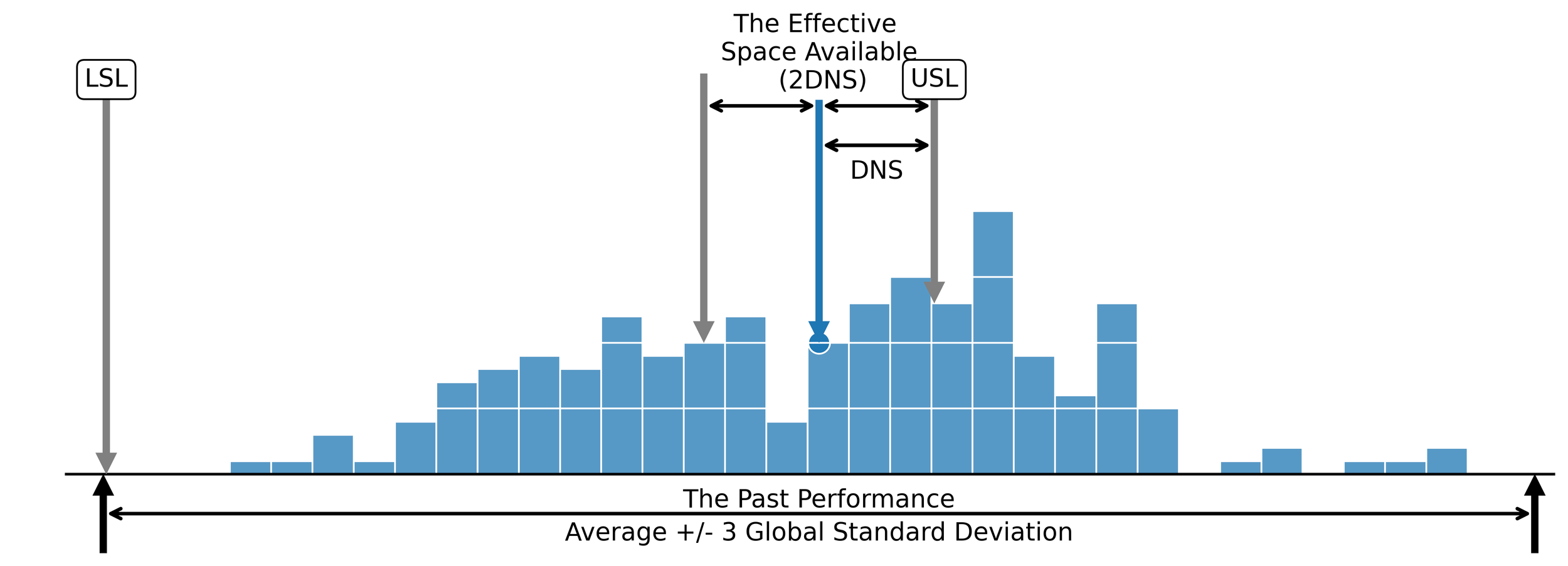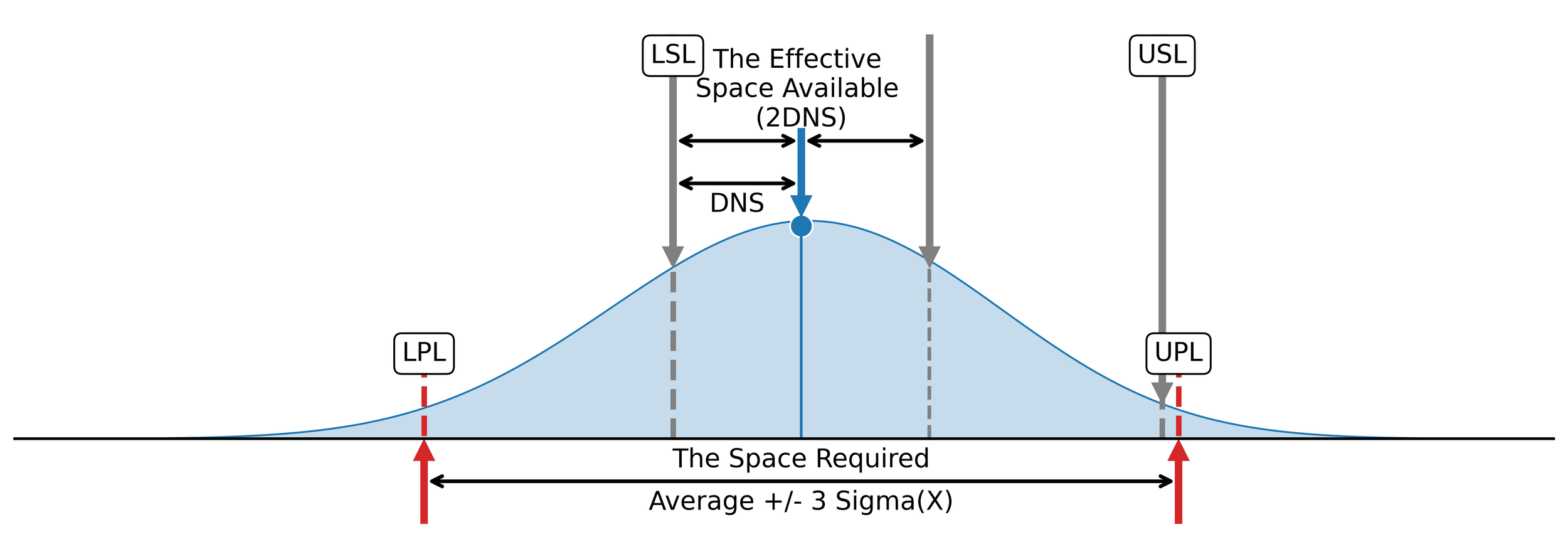 Hence, the DNS, which defines the numerators of the centered capability ratio and the centered performance ratio, reflects how the tolerance bounds the distance from the mean to the nearer specification limit.