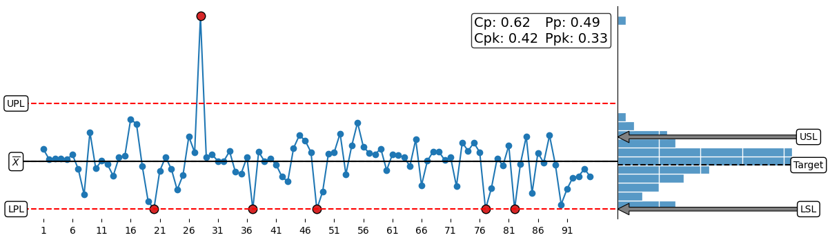 Figure 6. The X chart portion of an XmR chart (left) and the associated capability histogram (right).