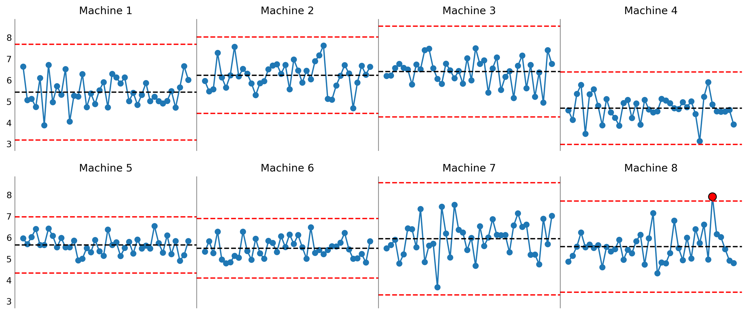 xmr_charts: Generates the type of process behavior chart called an XmR chart. Composed of an X chart and an mR chart, the XmR chart is used when a dataset is composed of logically comparable individual values.
