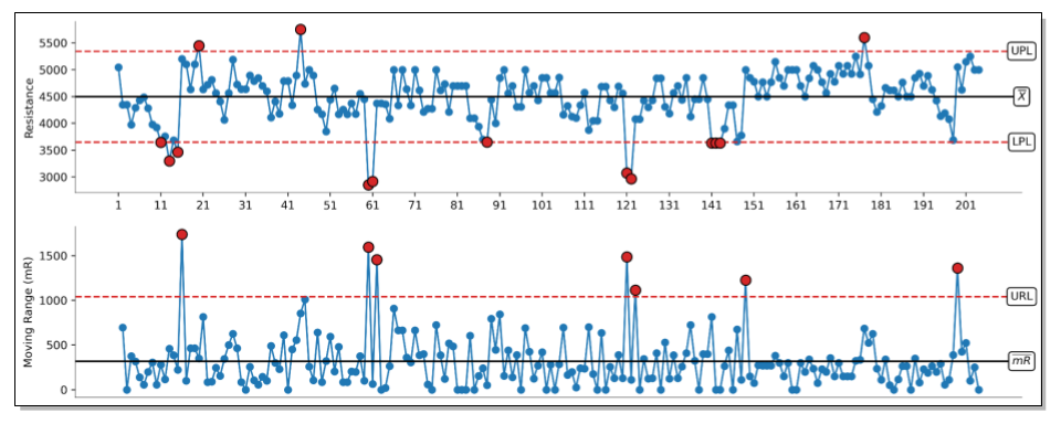 The primary tool of this library is the chart of individual values and a moving range called the XmR chart. However, the library is capable of generating other figures including: