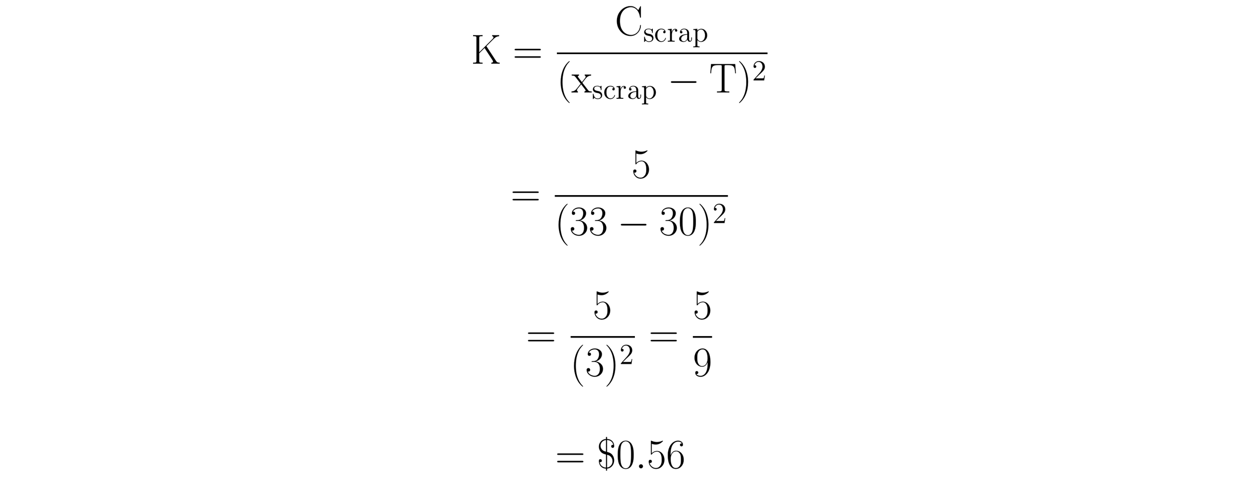 K is a function of the cost of scrap, C_scrap, and the squared deviation of x_scrap from the target. Here, C_scrap = $5, x_scrap = 33, and T = 30. Substituting these values into the formula for K yields a value $0.56.