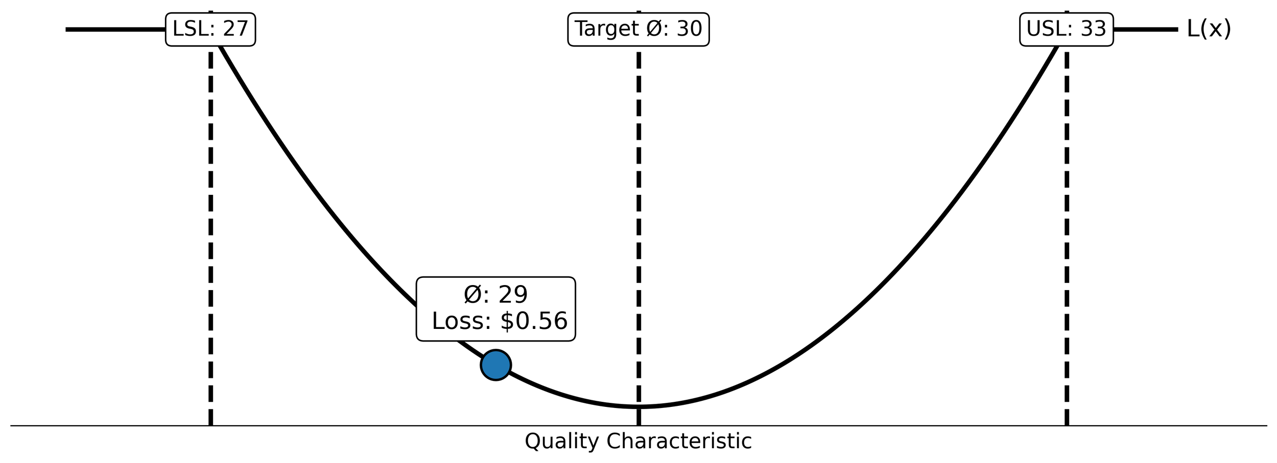 Figure 3. Quadratic loss function with loss associated with a part diameter of 29 units.