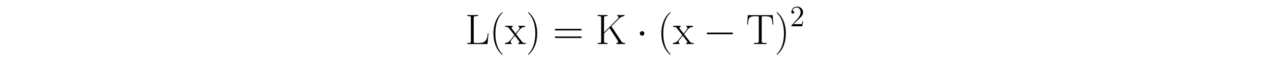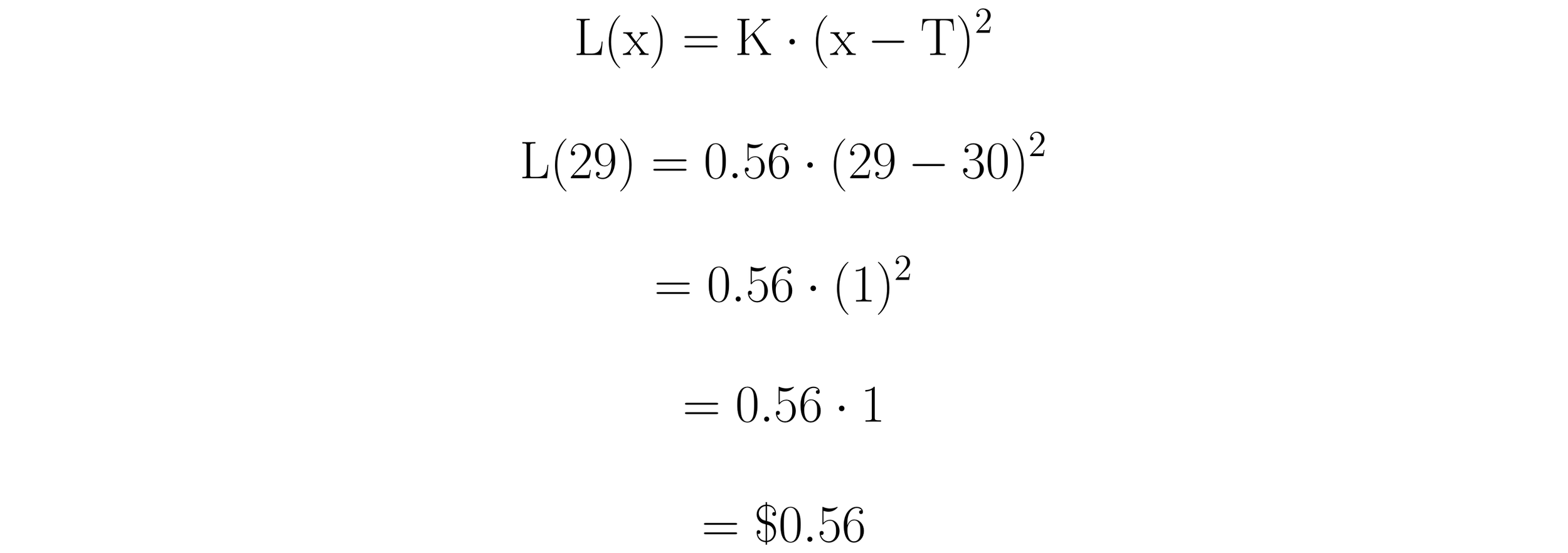 Here, L(x) is the loss function, K is a numeric constant expressed in dollars per unit squared, x is the measured quality or performance characteristic, and T is the target value.