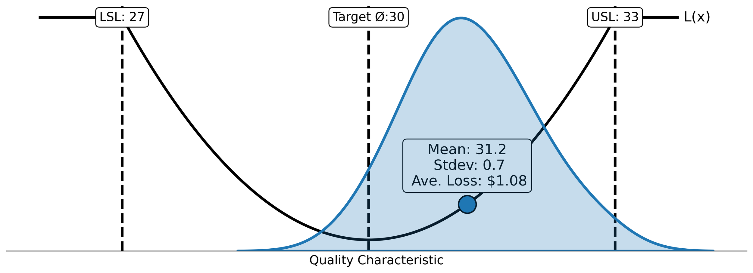Assume the manufacturing process from above produced 100 parts. Each of these parts will have a unique quality characteristic, x, and an associated loss that can be described as L(x). By summing the individual losses for the 100 parts, an average loss per unit of production can be obtained. This is expressed by the equation: