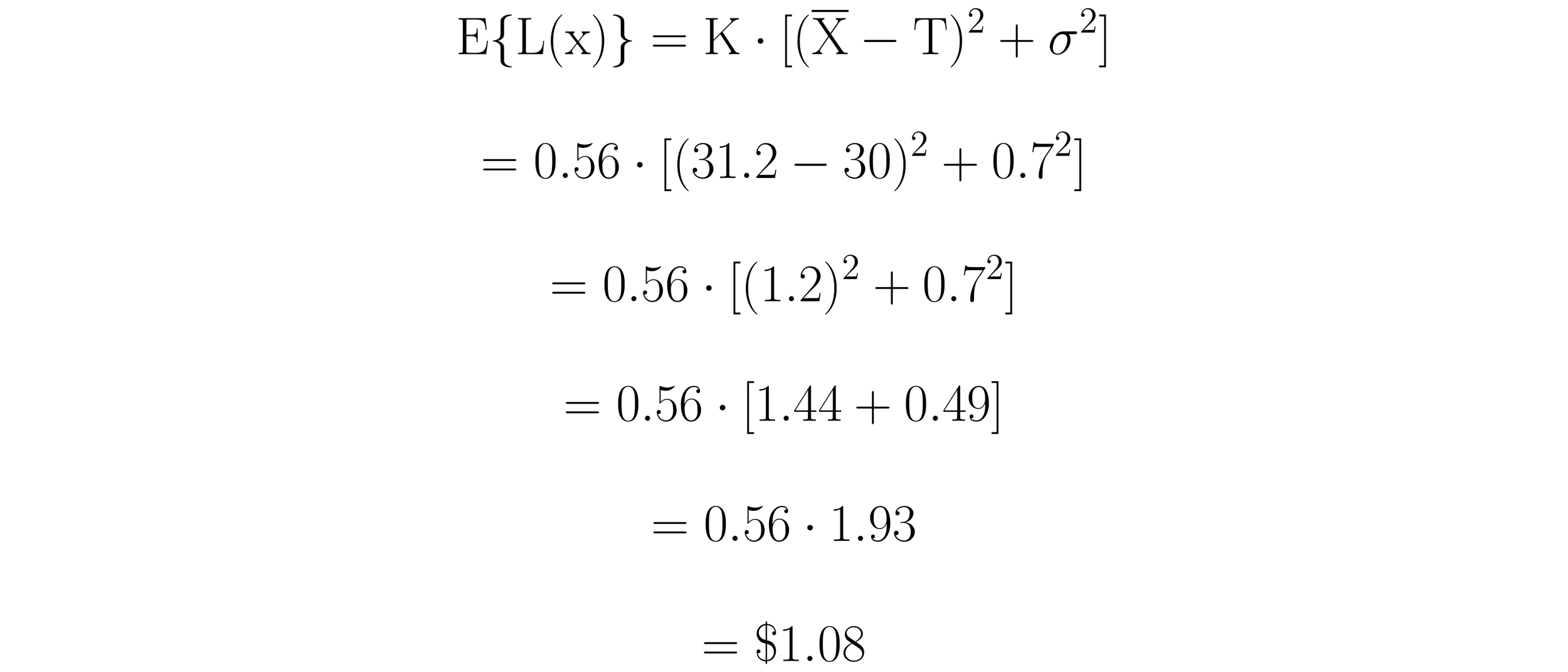 Here, E{L(x)} is the expected average loss per unit, K is again a numeric constant expressed in dollars per unit squared, X is the mean of the distribution, T is the target, and σ is the standard deviation statistic.
